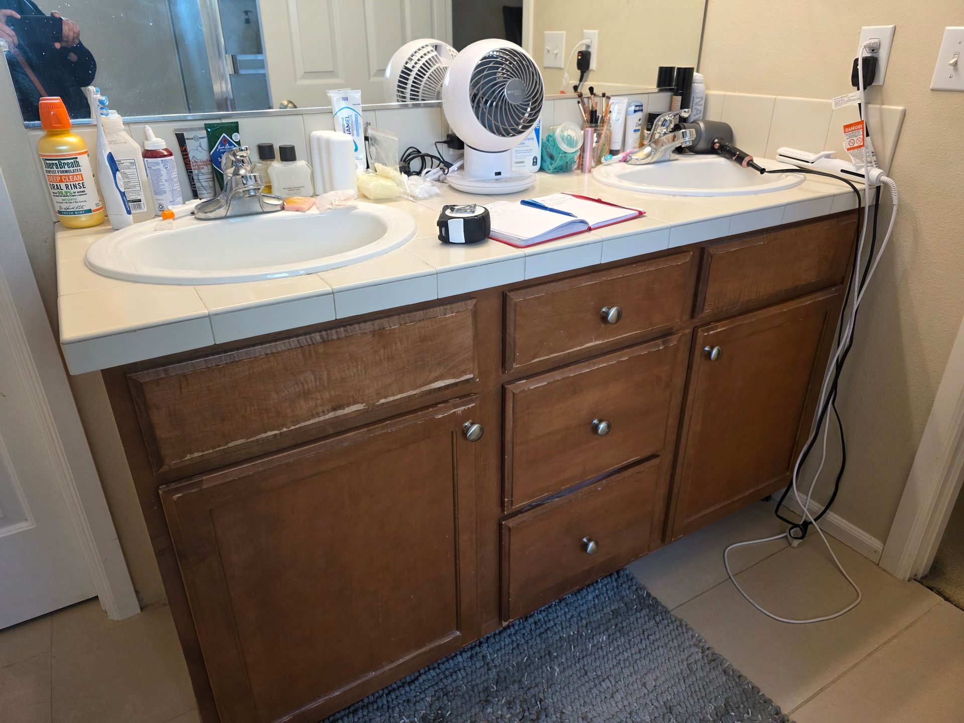 Install Vanity Cabinet - Width 59 ". 2 sinks,2 faucets
